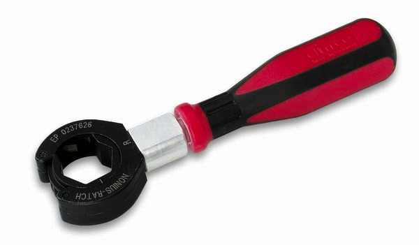 Offene Ringratsche geschlitzter Ratschenkopf mit abnehmbarem Kunststoff-Handgriff, Schlüsselweite SW20 zur Aufnahme aller nachfolgenden Schlüsseleinsätze, durch einfaches Umdrehen für Rechts- und Linkslauf, damit zum Anziehen und Lösen von Kabelverschraubungen geeignet. Auch in Kombination mit Art.-Nr. 115110 und 115112 verwendbar.