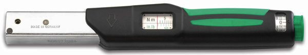 Drehmomentschlüssel; Auslösender Drehmomentschlüssel mit Aufnahme für austauschbare Steckwerkzeuge, einstellbar durch QuickSelect-Schnellverstellung (Sicherheitsverriegelung), Sichtfensteranzeige mit Nm und ft. lb bzw. in. lb, 2-Komponentengriff. Weiterbelastung nach dem Auslösen oder Belastungen entgegen der Funktionsrichtung, z. B. bei festsitzenden Schrauben, wirken nicht auf den Auslösemechanismus, der dadurch vor Beschädigung geschützt wird. Anzeigeabweichung ± 3 %. Größe der Werkzeugaufnahme in mm, bei Manoskopen (Innenvierkant) 9 x 12 mm. Lieferung erfolgt mit Bedienungsanleitung und Werk-Kalibrierschein. Nur verwendbar in Kombination mit Art-Nr. 115114 und 115100, Skalenbereich: 4- 20 Nm / 20-180 in. lb, Skalenteilung: 1 Nm/ 10 in. lb, Feinskalenteilung: 0,2 Nm, Gewicht 740 g