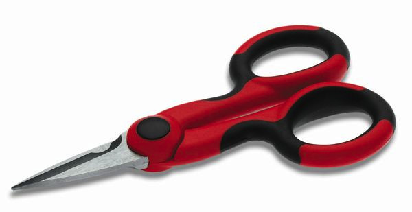 Elektriker-Schere; Schneiden aus rostfreier VA-Vanadium-Molybdaen-Legierung, eine Schneide fein gezahnt, Glasfaser-verstärkte schlagfeste 2-Komponenten- Kunststoffgriffe, Gesamtlänge 140 mm, Schneidelänge 47 mm. Zum Schneiden und Abisolieren von Leitern und Kabeln bis 22 mm Ø, zum Schneiden von Isolierband, Kabelbindern und anderen Materialien.