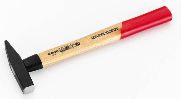 Sicherheits-Schlosserhammer, Baumaße und Verarbeitung GS-zertifiziert nach DIN 1041/1193. Mit Stielschutzkragen und zusätzlicher Nylon-Stielschutzhülse. Mit doppelt geschweiftem Hickory-Stiel, Hammerkopf durch Ringkeil und Kunstharz-Versiegelung doppelt gesichert. Gewicht 200 g