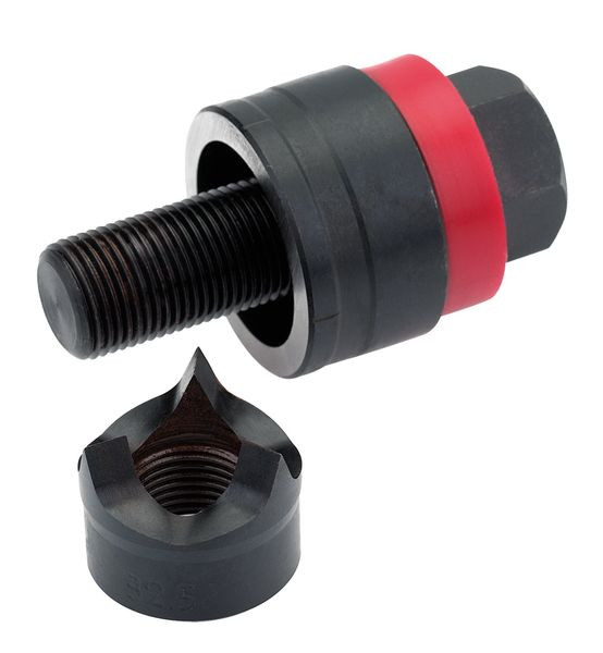 Schraublocher Diamant ein innovativer Spalt-Stempel mit drei Schneidspitzen: Stanzabfall wird in drei Teile gespalten. Geeignet für: Stahlblech (ST 37), Kunststoff und Aluminium. Betätigung: Manuell und hydraulisch. Ausführung: Mit Stempel und Matrize, Zugschraube mit Kugellager. Loch-Ø 25,4 mm; Materialstärke 2,0 mm; Nennmaß metrisch 25 mm; Größe 1"; Schraubengröße 9,5x50,0 mm; Vorbohr-Ø 10,0 mm