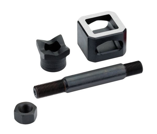 Schraublocher Quadrat; patentierte Matrize; Mit seitlichem Auswurf für das Abfallstück. Geeignet für: Stahlblech (ST 37), Kunststoff und Aluminium. Betätigung: Hydraulisch. Ausführung: Mit Stempel, Geeignet fur: Stahlblech (ST 37), Kunststoff und Aluminium. Betätigung: Hydraulisch. Ausführung: Mit Stempel, Matrize, Hydraulikschraube und Kontermutter. Aufbewahrung: In praktischem, stabilem Kunststoff-Koffer. Nennmaß 68,0x68,0 mm, Vorbohr-Ø 24,0 mm, max. Materialstärke 3,0 mm