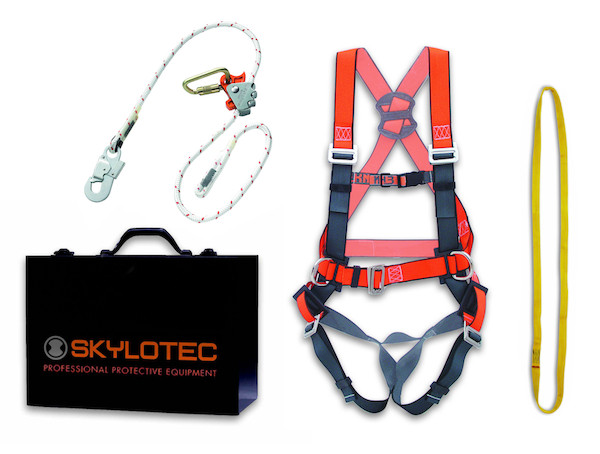 Elektriker-Sicherheits-Set Standart; Einsatzbereich für dieses Set sind Reparatur- und Instandsetzungsarbeiten, z. B. Arbeiten an Dachschrägen. Die Auffangösen vorne und an den Seiten entsprechen den BG-Richtlinien für Arbeiten in absturzgefährdeten Bereichen. Im stabilen Stahlblech-Koffer sind enthalten: Auffanggurt (EN 361/358,) Bandschlinge 30 KN - 1 Meter, Mitlaufendes Halteseil ERGOGRIP