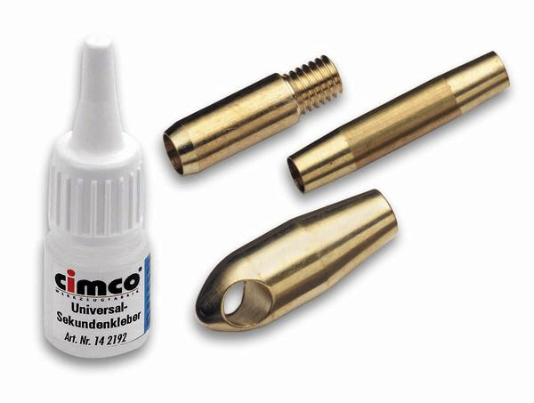 Katimex® Kabelmax® Service-Set, bestehend aus 5 Anfangshülsen, 3 Verbindungshülsen, 1 Führungskopf mit Öse und 1 Flasche Spezialkleber. Gewicht ca. 45g.