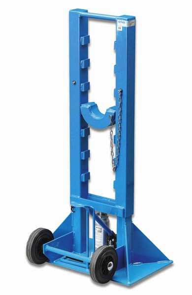 Katimex®Kabeltrommelheber Hydrokat®, hydraulischer Kabeltrommelheber, fahrbar, leicht von einer Person an der Kabeltrommel zu positionieren, sichere Lastaufnahme durch Doppelsäulen, 7-stufige bzw. 13-stufige Höhenverstellung der Achslagerschalen über Rasten. Hubhöhe 150 mm, Belastbarkeit 10.000 kg pro Paar, Standfläche 540x340 mm. Für Kabeltrommel mit einem Ø von 700 mm bis 2200 mm; Bauhöhe: 1070 mm; Gewicht: 53 kg.
