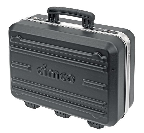 Werkzeugkoffer Klassik der Profi-Hartschalenkoffer aus schlagfestem 3 mm starkem ABS-Kunststoff, Bodenaußenschale mit 4 standsicheren Füßen, umlaufender Aluminiumrahmen, seitlich angebrachter Halterungen für Schultertrageriemen (CIMCO-Artikelnr. 17 0275), 3 herausnehmbare Werkzeugtafeln mit gummierten Werkzeugeinschublaschen, seperate Dokumenten-Aufbewahrung, Bodenschale mit individuell verstellbaren Facheinteilern für Kleinteile, Messgeräte, Werkzeug etc. 2 abschließbare Schlösser. Ausführung Kofferschale mit Auflagepunkten, 3 Scharniere inkl. Oberschalen-Positionshalter, massiver Griff, abgeflachte Kanten als Kofferschalenschutz sowie eine Halterung für Schultertrageriemen. Koffer leer, mit einem Gewicht von 6.000 g. Außenmaß: B/T/H: 487/425/233 mm; Innenmaß B/T/H1/H2/H#: 470/348/125/85/210 mm.