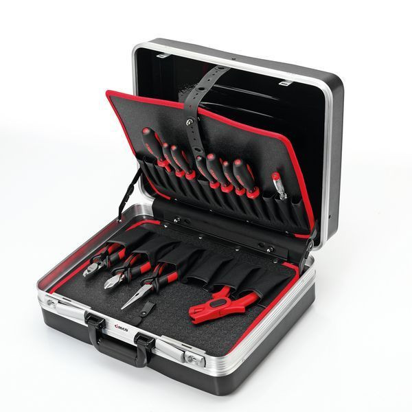 Ein preiswerter, dennoch absolut professioneller Hartschalen-Werkzeugkoffer-Metro. Ausstattungsmerkmale: Kofferschalen aus ABS-Material, umlaufender Aluminiumrahmen mit 2 integrierten abschließbaren Kippschlössern, Belastbarkeitbis 15 kg, 2 Werkzeugtafeln mit insgesamt 26 Werkzeug-Einsteckfächern. Dokumenten-Klemmfach 400 mm breit, frei unterteilbare Bodenschale inkl. Trennstegen, Deckelhalter und Scharniere aus Metall, Kunststoffbodengleiter. Koffer bestückt mit 13 Werkzeugen: 1.000 V Telefonzange mit geraden Backen 200 mm geprüft nach DIN ISO 57456 (CIMCO-Artikelnr. 17 00731), 1.000 V Seitenschneider 160 mm (CIMCO-Artikelnr. 10 0216), Jokari-Abisolierzange Super 4 (CIMCO-Artikelnr. 10 0760), Phasenprüfer 120-250 V AC, 3,0/65 mm (CIMCO-Artikelnr. 11 1280), 1.000 V Schlitz-Schraubendreher 185 mm geprüft nach DIN EN 60900, 3,0x0,5 mm (CIMCO-Artikelnr. 11 7702); 1.000 V Schlitz-Schraubendreher 185 mm, geprüft nach DIN EN 60900, 4,0x0,8 mm (CIMCO-Artikelnr. 11 7704); 1.000 V Schlitz-Schraubendreher 220 mm geprüft nach DIN EN 60900, 5,5x1,0 mm (CIMCO-Artikelnr. 11 7705); 1.000 V Kreuzschlitz-Schraubendreher PH 1,80 mm geprüft nach DIN 7438 (Cimco-Artikelnr. 11 7731); 1.000 V Kreuzschlitz-Schraubendreher PH2, 100 mm, DIN 7438; (CIMCO-Artikelnr. 11 7732); 1.000 V Kreuzschlitz-Schraubendreher PZ1, 80 mm (CIMCO-Artikelnr. 11 7741); 1.000 V Kreuzschlitz-Schraubendreher PZ 2, 100 mm (CIMCO-Artikelnr. 11 7742) Kabelschere DUOCUT, 160 mm, mit zweistufigem Schneidenbereich (CIMCO-Artikelnr. 12 0108); JOKARI Kabelmesser mit Hakenklinge, mit einem Ø von 8 - 28 mm (CIMCO-Artikelnr. 12 1010). Außenmaße B/T/H: 478/398/202 mm; Innenmaß: L/B/H1/H2/H#: 464/355/115/70/185 mm.