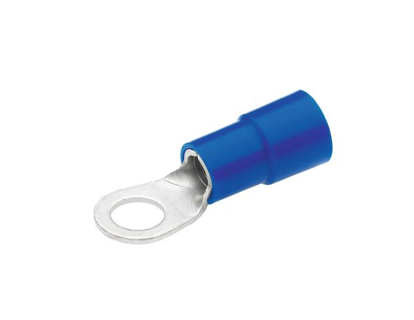 Isolierte Quetschkabelschuhe, Ringform Cu, isoliert, DIN 46237 von 0,5 - 6 mm². Technische Daten - Werkstoff: Cu-ETP nach DIN EN 13600 - Oberfläche: galvanisch verzinnt - Für zugentlastete Verbindungen - Isolation PA (Polyamid, Nylon), halogenfrei - Temperaturbeständigkeit -60°C bis +105°C - Easy Entry ermöglicht einfaches und schnelles Einführen des Leiters, 600 V max. Ausführung: Querschnitt: 16 mm², Bolzen mit einem Ø von 5 mm, Isolationsfarbe: blau, D1: 5,8, D2: 9,6, D3: 5,3, A1: 21,5, B 11, L 30, Gewicht per 100 St.~: 0,494 kg, nach DIN :-, UL gelistet: x, VE/Stck.: 50.
