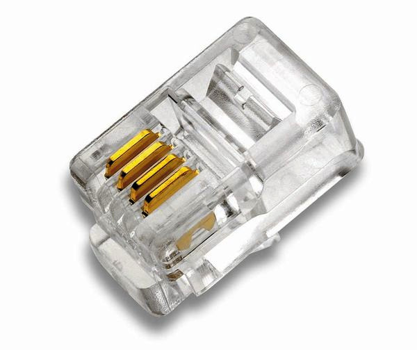 Modular-Stecker für Telekommunikation und Daten-Netzwerke, Qualitätsstecker für mindestens 500 Steckzyklen, Kontakte mit 50µ inch (1,27 Mikrometer) Goldauflage, Gehäuse aus flammhemmendem Polycarbonat, Zugbelastbarkeit Kabel zu Stecker mindestens 89 N. Ungeschirmte Modularstecker (mind. Cat. 3) geeignet für Flach- und Rundkabel. Ausführung: für flexible Leiter, Bezeichnung: RJ 10; AWG Bereich: 24-26; Anzahl der Positionen: 4; Anzahl der Kontakte: 4; VE/Stck.: 100