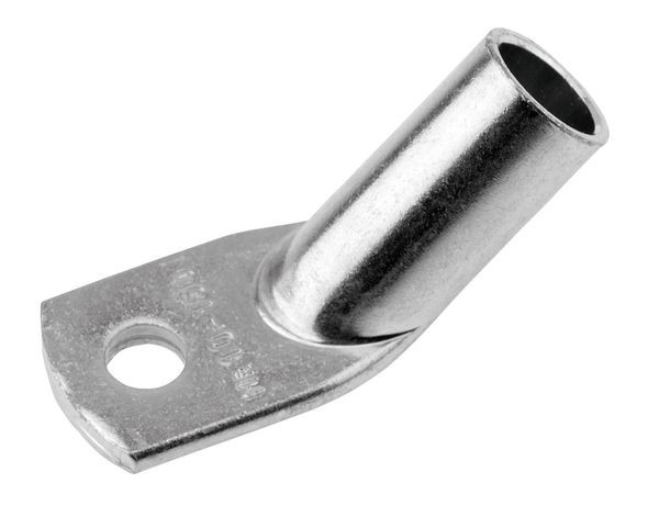 Winkel-Rohrkabelschuhe Cu, Normalausführung 90°C und 45° abgewinkelt - Technische Daten - Werkstoff: Cu-ETP DIN EN 13600 - Oberfläche: galvanisch verzinnt, andere Oberflächen auf Anfrage - Auch geeignet für feindrähtige Leiter IEC 228 - Ausgeglüht auf Kupferhärte F 20. Ausführung: 45° abgewinkelt; Querschnitt: 120 mm²; Bolzen-Ø: 12 mm; Gewicht per 100St.:~kg: 7,71; Pressung 7 mm: 1; Pressung 5 mm: 2; VE/Stck.: 1