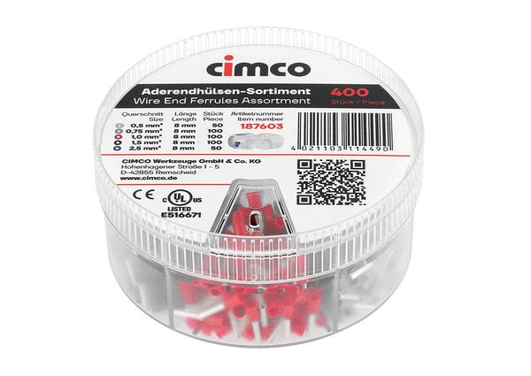 Aderendhülsen-Streudose mit einfacher Querschnittszuordnung der Fächer. Isolierte Aderendhülsen nach DIN 46228-4, gefertigt aus hochwertigen Kupfer-DHP. Die Oberfläche ist galvanisch verzinnt mit einer Mindestschichtstäke von 3 µm für einen maximalen Korrosionsschutz. Der Kunststoffkragen aus Polypropylen sorgt für ein einfaches Einführen der Kupferleiter. Temperaturbeständig bis 105°C, für Leitungen Klasse 5 / 6 nach IEC 60228. Das Set beinhaltet Aderendhülsen in den Größen 0,5 mm², 0,75 mm², 1 mm², 1,5 mm² und 2,5 mm²