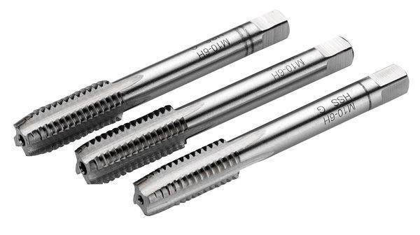Handgewindebohrer DIN 352/HSS, für metrisches ISO-Gewinde nach DIN 13 (Toleranz 6 H), Dreiteiliger Satz: Vorschneider - Mittelschneider - Fertigschneider. Ausührung: Gewinde: M6; Steigung: 1,00 mm; Schaft-Ø: 6,0 mm; Gesamtlänge: 50 mm; VE: 1