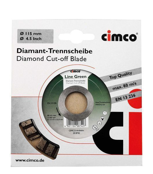 Diamant-Trennscheiben Line Green, mit aufgelaserten Diamantsegmenten, Stammblatthärte: 38 HRC, geeignet für: Betonerzeugnisse (mittelhart/hart), Stahlbeton, Waschbeton, Bordstein, Pflaster, Verbundstein, Dachziegel (mittelhart), Hohlblockstein, Mauerstein, Ziegel (hart), Kalksandstein (hart/hoch verdichtet), Quadroblock, Sandstein (hart), Klinker (hart/mittelhart), Gussrohr (duktil), Schamott (weich), Basalt und Naturstein. Ausführung: 10 mm Höhe; Segment Länge: 31,5 mm; Anzahl: 10; Ø: 125 mm