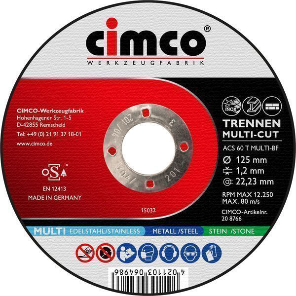 Korund-Trennscheiben Multi-CUT. Geeignet für: Kantige Stahlprofile, Guss, Aluminiumlegierung, Kupfer, Messing und Bronze, Marmor, Schiefer, kantige Edelstahlprofile, Fliesen, unlegierte und legierte Baustähle, Baustähle hoher Festigkeit, rost- und säurebeständige Stähle. Kombi-Scheibe für Edelstahl, Stahl und Stein (insbesondere Wandfliesen) geeignet, spezielle MaterialZusammensetzung der neuen dünnen Kombi-Scheibe ermöglicht das Trennen von Metall und z. B. Fliesen ohne aufwändigen Scheibenwechsel, gute Schneidleistung und angenehmes Schneidverhalten, gratarme bis gratfreie Kanten. Ausführung: Stärke 1,2 mm; Ausführung: gekröpft; Ø: 125 mm