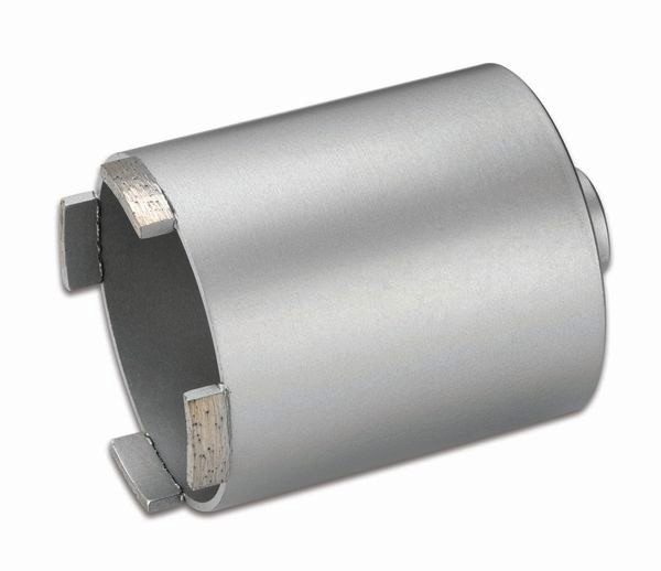 Diamant-Bohrkrone Solid L mit einer Arbeitslänge von 90 mm, mit aufgelaserten Diamantsegmente aus Diamantkorn- Bindung; geeignet für: Betonerzeugnisse (weich), Hohlblockstein, Mauerstein, Ziegel (weich), Kalksandstein (weich abrasiv/hart/hochverdichtet), Putz und Gasbeton Ausführung: Höhe 8 mm; Segment Länge: 24 mm; Anzahl: 4; Ø: 82 mm