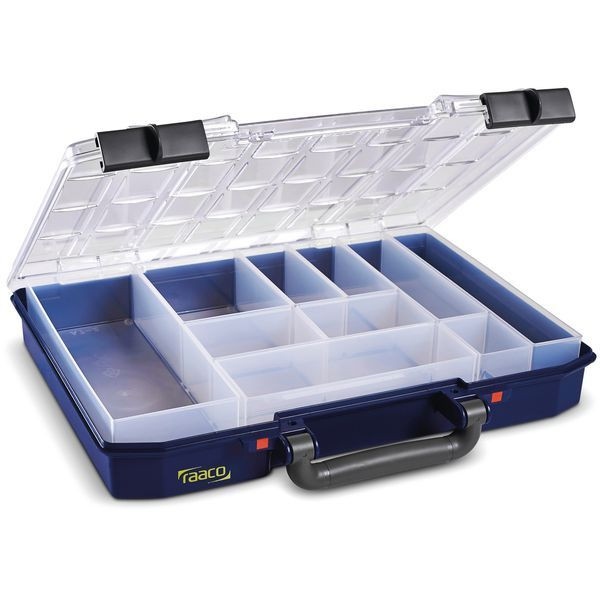 CarryLite 55, 4x8, inkl. 10 Einsätze, ausgestattet mit Schiebeverschlüssen und Tragegriff, 2 rote Markierungen an den Verschlüssen zeigen an, ob der Koffer korrekt geschlossen ist, mit U-Profilen im Deckel, die ein Verrutschen des Inhalts beim Transport verhindern, Sortimentskoffer mit 10 Einsätzen: 1 Stück Typ A9-1, 2 Stück Typ A9-2, 1 Stück Typ A9-3, 1 Stück Typ A9-4, 2 Stück Typ A8-1, 1 Stück Typ A8-2, 1 Stück Typ A7-1 und 1 Stück Typ A7-2, Farbe: raaco blau. Tragvermögen: 8 kg, Gewicht: 0.924 g, T x B x H 278 x 337 x 57 mm; Raster 4x8