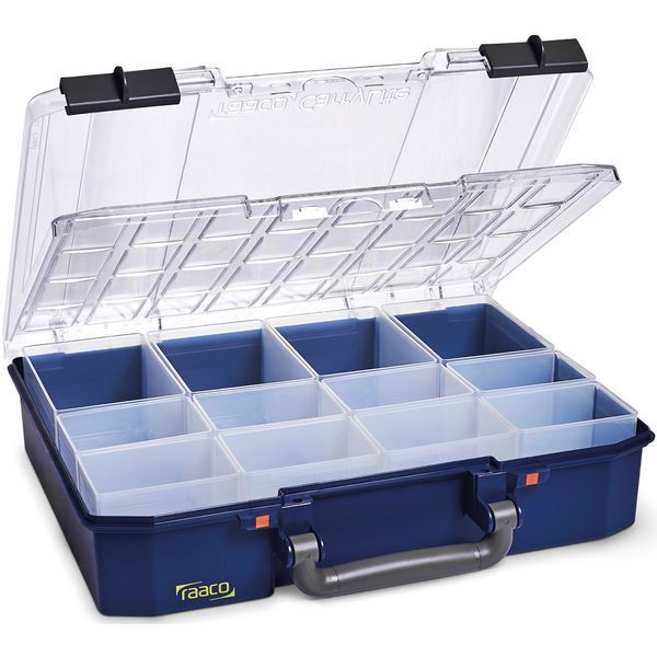CarryLite 80 4x8 DLU, inkl. 12 Einsätze, mit Einlegefach für Dokumente. Sortimentskoffer inkl. Sandwich-Deckel mit U-Profilen die ein Verrutschen des Inhalts beim Transport verhindern, Sandwichdeckel mit Einlegefach, z. B. für bis zu 5 lose Blatt Papier à 80 g, ausgestattet mit Tragegriff und 2 Schiebeverschlüssen, 2 rote Markierungen an den Verschlüssen zeigen an, ob der Koffer korrekt geschlossen ist, inkl. 8 Stück Einsätze Typ BA8-1 und 4 Stück Typ BA7-1, Farbe raaco blau. Tragvermögen: 10 kg, Gewicht: 1.246 g; T x B x H 278 x 337 x 82 mm: Raster 4x8
