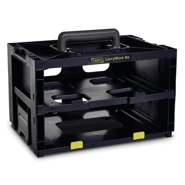 CarryMore 80, Lager- und Transportsystem, zur Aufbewahrung von 2 CarryLite 80 4x8 Sortimentskoffer,, mit ergonomischem Tragegriff und Arretierungsmechanismus zur festen Verbindung mehrerer CarryMore-Tragerahmen, Stoppränder, die das Herausrutschen der Carry Lite-Koffer verhindern, Tragvermögen: 25 kg, Gewicht: 1.935g, Farbe: schwarz. Ausführung: leer; T x B x H 278 x 86 x 241 mm