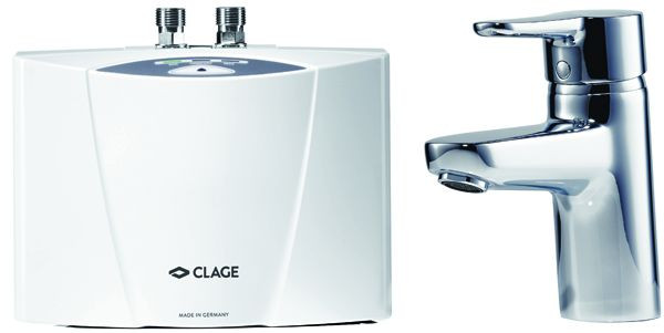 Elektronisch geregelter Klein-Durchlauferhitzer im Set mit neuartiger Waschtischarmatur zur energieeffizienten Warmwasserversorgung eines Handwaschbeckens. Der kleine Durchlauferhitzer wird unter dem Waschbecken installiert und erwärmt das Wasser exakt auf die Nutztemperatur, ohne dass Wasser beigemischt werden muss. Dies wird unterstützt durch die intuitiv zu bedienende Armatur, deren Bedienhebel bei mittlerer Stellung warmes Wasser liefert. Die innovative Strömungstechnik sorgt für optimale Hygiene und Energieeffizienz.