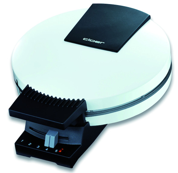 kuchenartige Waffeln 19,5 cm Ø, 1,35 cm dick, Antihaftbeschichtung, stufenlos wählbarer Bräunungsgrad, Backampel, innenliegendes Scharnier, flexibles Scharnier für ein besseres Aufgehen der Waffel, Fettauffangrille, Kabelaufwicklung mit Steckerdepot, platzsparende, auf den Griffen stehende Aufbewahrung