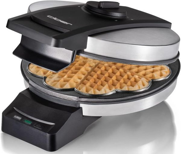 Waffeln 19,5 cm Ø, doppelte Antihaftbeschichtung, besonders zuckerresistent, robuste 3,2 kg schwere Ausführung, für den gewerblichen Gebrauch geeignet, stufenlos wählbarer Bräunungsgrad, optische und akustische Fertigmeldung, innenliegendes Scharnier, flexibles Scharnier für ein besseres Aufgehen der Waffel, Fettauffangrille, außenliegende Kabelführung, patentierte Kabelaufwicklung, die das Gerät verriegelt, platzsparende Aufbewahrung durch Aufstellen auf den Griff, spritzwassergeschützter An-/Ausschalter