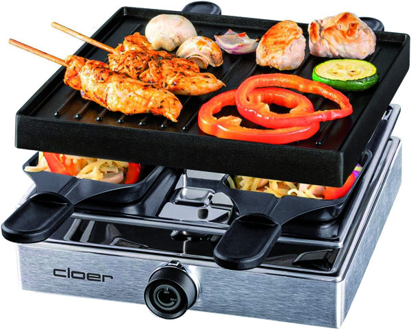 abnehmbare antihaftbeschichtete Aluminium-Druckgussplatte 21 x 21 cm, antihaftbeschichtete Pfännchen mit wärmeisolierten Griffen, 4 Kunststoffspachtel, unbeheizter „Parkplatz“ für leere Pfännchen, Drehregler zur Temperaturkontrolle mit Kontrollleuchte