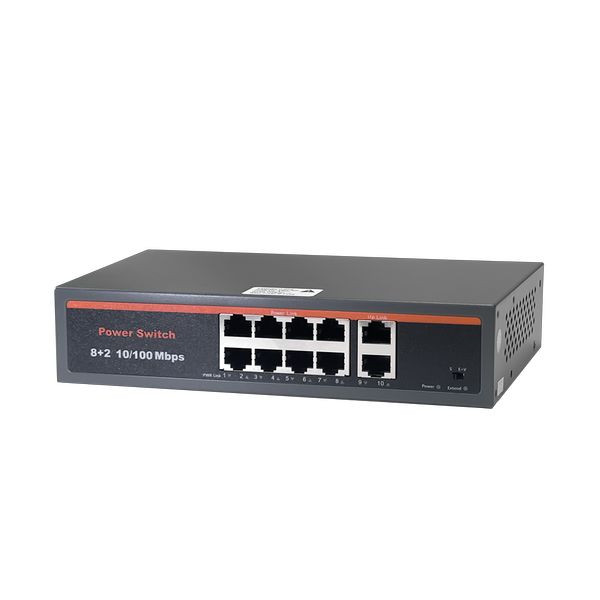 Netswerk Switch mit 8 SPoE ports 10/100 Mbps + 2 Uplink ports 10/100 Mbps. Leistung 120W mit einer Ausgangsspanung von 24VDC. Abmessungen: 188x44mm