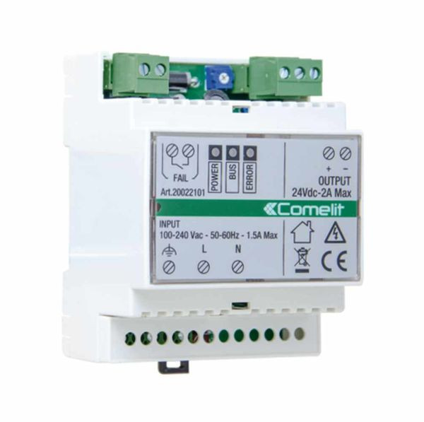 Parallelschaltbares, selbstschützendes Netzteil für SimpleHome-System, 24 Vdc 2 A, versorgt die Module im SimpleHome-BUS-System mit Strom. Kann bis zu 2 A liefern und bei höherem Stromverbrauch können mehrere Netzteile an den Bus angeschlossen werden, verteilt auf verschiedene Teile des Systems, das Netzteil ist mit einem Relais-Ausgangskontakt zur Störungsmeldung ausgestattet. Abmessungen 71x90x58 mm (4 DIN-Module).