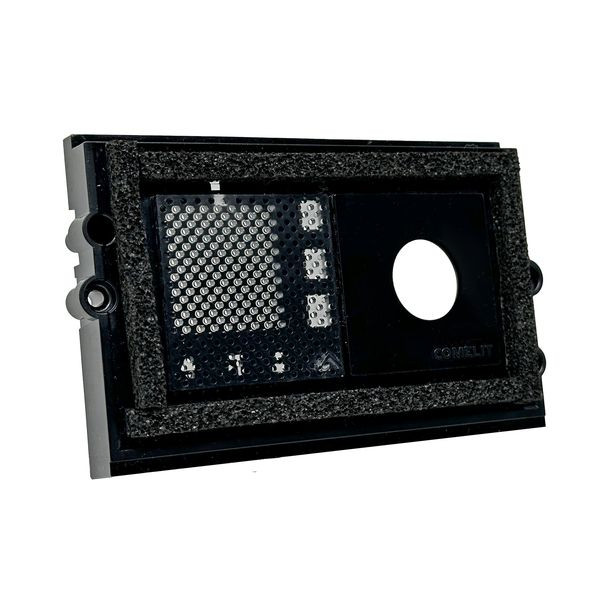 Einbauhalter Serie Ultra für Audio-Video-Systeme als Universalhalter zum Einbau und zur Verwendung der Lautsprechereinheit Art. EU1020, Art. EU2020, Art. 2020/4, Art. EU8020, inkl. Handicap Funktion nach DIN18040 an vorhandene Türstationen sowie Briefkastenanlagen. Der bauseitig oder durch den Briefkastenhersteller erstellte Ausschnitt sowie die Bolzen zur Befestigung des Art. EU1250V sind gemäß Comelit Zeichnung zu erstellen. Der Einbauhalter EU1250V ist ausgestattet mit einem Videoglas zur Verwendung einer Audio-Video-Einheit. Beleuchtung der Namensschilder ist bauseits, unabhängig von der Spannungsversorgung der Sprechanlage, vorzunehmen.