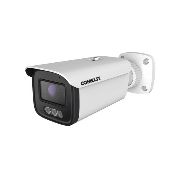 Kamera IP Bullet Serie Next Color UP, motorisiertes Objektiv 2,8-12 mm, Auflösung 8MP@20 fps, Licht-LEDs mit einer Reichweite von 30 Metern, IR-LEDs mit einer Reichweite von 30 Metern (Smart IR), ColorUp (Licht-LED), Dual Light (IR+Licht-LED mit Unterscheidung zwischen Mensch/Fahrzeug) und IR-LED-Funktion. ONVIF-kompatibel. Funktionen zur Videoanalyse: Eindringen in einen Bereich (Unterscheidung zwischen Menschen/Fahrzeugen), Linienüberquerung (Unterscheidung zwischen Menschen/Fahrzeugen), Funktion für verlassene/entfernte Objekte. WDR 120 Db, Videokompression H.265+ / H.265 / H.264+ / H.264 / MJPEG, SD-Slot (max. 256 GB). Audio: 1 Eingang, eingebautes Mikrofon. Wasserdichtes IP67-Gehäuse aus Aluminiumdruckguss, Stromversorgung 12 VDC / PoE IEEE802.3af. Kompatibel mit Browsern: Google Chrome/Edge/Firefox/Safari. Kompatibles Zubehör: JBA-BA, CMA-BA, WMA-BA, PMA-A, AMA-A