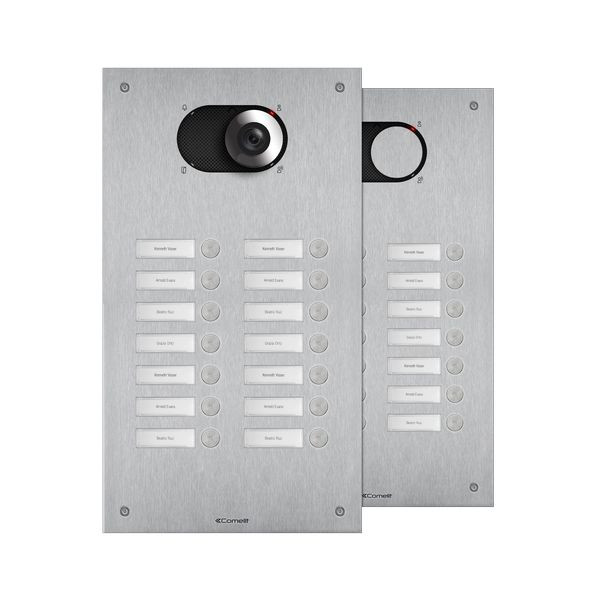 Frontplatte Serie Switch, 14 Teilnehmer, 2-reihig, SB2, VIP. Zu vervollständigen mit dem UP-Gehäuse IX9153 oder AP-Gehäuse IX9163 sowie mit dem Lautsprecher Audio oder Video (Systemabhängig) Art. 1621, 1621VC, 1682, 4680C, 4681 oder 4682HD. Frontplatte aus 2,5mm starker Edelstahlplatte V4A und vierzehn flächenbündig integrierten Klingeltasten. Namensschilder von vorne zu wechseln, inkl. rückseitiger LED-Beleuchtung. Integriertes Ausstattungsmerkmal ist die Handicap-Funktion nach DIN 18040 mit Zustandsanzeige Türruf, Gesprächsbereit, Türöffnerfunktion und Teilnehmererreichbarkeit visuell mit LED´s hinter genormten Handicap Symbolen sowie akustischer Sprachausgabe der Zustände. Zu verwenden mit Netzgerät Art. 1210. Schlagfestigkeit: IK08. Abmessungen: 395,7x216,4x2,5mm.