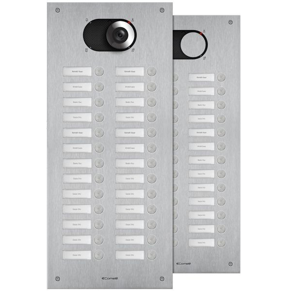 Frontplatte Serie Switch, 26 Teilnehmer, 2-reihig, SB2, VIP. Zu vervollständigen mit dem UP-Gehäuse IX9154 oder AP-Gehäuse IX9164 sowie mit dem Lautsprecher Audio oder Video (Systemabhängig) Art. 1621, 1621VC, 1682, 4680C, 4681 oder 4682HD. Frontplatte aus 2,5mm starker Edelstahlplatte V4A und sechsundzwanzig flächenbündig integrierten Klingeltasten. Namensschilder von vorne zu wechseln, inkl. rückseitiger LED-Beleuchtung. Integriertes Ausstattungsmerkmal ist die Handicap-Funktion nach DIN 18040 mit Zustandsanzeige Türruf, Gesprächsbereit, Türöffnerfunktion und Teilnehmererreichbarkeit visuell mit LED´s hinter genormten Handicap Symbolen sowie akustischer Sprachausgabe der Zustände. Zu verwenden mit Netzgerät Art. 1210. Schlagfestigkeit: IK08. Abmessungen: 502,1x216,4x2,5mm.