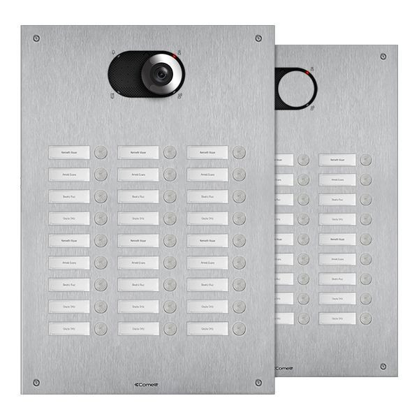 Frontplatte Serie Switch, 27 Teilnehmer, 3-reihig, SB2, VIP. Zu vervollständigen mit dem UP-Gehäuse IX9155 oder AP-Gehäuse IX9165 sowie mit dem Lautsprecher Audio oder Video (Systemabhängig) Art. 1621, 1621VC, 1682, 4680C, 4681 oder 4682HD. Frontplatte aus 2,5mm starker Edelstahlplatte V4A und siebenundzwanzig flächenbündig integrierten Klingeltasten. Namensschilder von vorne zu wechseln, inkl. rückseitiger LED-Beleuchtung. Integriertes Ausstattungsmerkmal ist die Handicap-Funktion nach DIN 18040 mit Zustandsanzeige Türruf, Gesprächsbereit, Türöffnerfunktion und Teilnehmererreichbarkeit visuell mit LED´s hinter genormten Handicap Symbolen sowie akustischer Sprachausgabe der Zustände. Zu verwenden mit Netzgerät Art. 1210. Schlagfestigkeit: IK08. Abmessungen: 448,9x302,9x2,5mm.