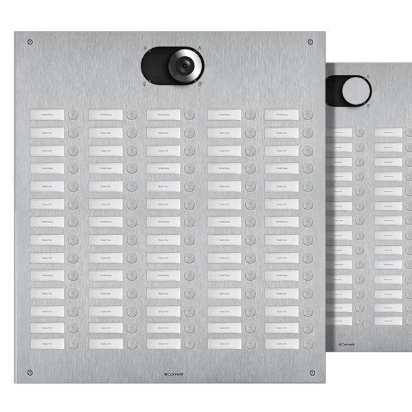 Frontplatte Serie Switch, 70 Teilnehmer, 5-reihig, SB2, VIP. Zu vervollständigen mit dem UP-Gehäuse IX9183 oder AP-Gehäuse IX9179 sowie mit dem Lautsprecher Audio oder Video (Systemabhängig) Art. 1621, 1621VC, 1682, 4680C, 4681 oder 4682HD. Frontplatte aus 2,5mm starker Edelstahlplatte V4A und siebzig flächenbündig integrierten Klingeltasten. Namensschilder von vorne zu wechseln, inkl. rückseitiger LED-Beleuchtung. Integriertes Ausstattungsmerkmal ist die Handicap-Funktion nach DIN 18040 mit Zustandsanzeige Türruf, Gesprächsbereit, Türöffnerfunktion und Teilnehmererreichbarkeit visuell mit LED´s hinter genormten Handicap Symbolen sowie akustischer Sprachausgabe der Zustände. Zu verwenden bei Buslautsprechern mit Netzgerät Art. 1210 zzgl. Art. 1595, ViP auf Nachfrage. Schlagfestigkeit: IK08. Abmessungen: 608,5x495x2,5mm.