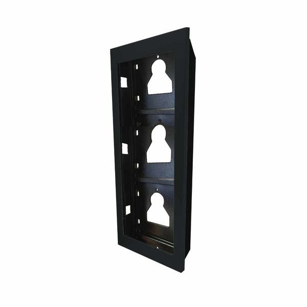 Montagerahmen für Ultra zur Unterputzmontage, 3 Module. Er besteht aus der Metallhalterung zur Befestigung der Module ohne den Einsatz von Schrauben, sowie dem Rahmen aus kataphoresebehandeltem Aluminiumdruckguss zur Erhöhung der Beständigkeit gegen chemische und umweltbedingte Korrosionsprozesse, einschließlich UV-Strahlen. Überstand von der Wand 10mm. Zu verwenden mit den Unterputzgehäusen Art. 3110/3 sowie Art. 3110/3A mit der Möglichkeit, mehrere Module horizontal nebeneinander anzuordnen. Farbe: schwarz. Abmessungen: 125,5x317,5x35mm.