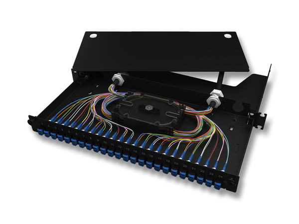 Spleiß-Verteilerfeld mit Kupplungen, Spleißkassetten und Pigtails (PGTL), LC Duplex OS2, 48 Fasern, blaue Kupplungen, schwarz