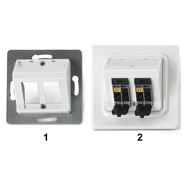Modular aufgebaute Anschlussdose PS-TERA 2x für den Kanaleinbau (UP-K) zur Aufnahme von 2 Modulen PS-TERA, mit Schrägauslass, die Module lassen sich leicht in die Dose einklicken, Beschriftungsfeld mit Papierschild und transparenter Abdeckung, Lieferung erfolgt ohne Module.
