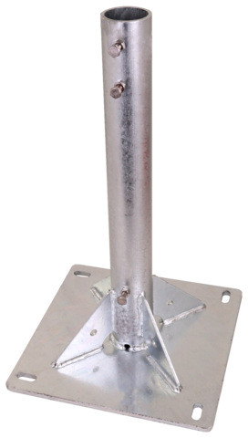 Stützrohrständer mit Standfuß St/tZn zur Aufnahme von Ø50 mm Stützrohren. Mit Reduzieradapterset Art.-Nr. 107 399 ist eine Aufnahme von Ø40 mm Fangstangen möglich. Zum Errichten direkt an Gewerke oder mittels Gegenplatte mit Langloch montierbar.