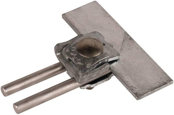 Falzklemme nach DIN EN 62561-1, zum Verbinden von Rundleitern mit Falzen. Ausführung mit Doppelüberleger, Leitungsführung längs oder quer.