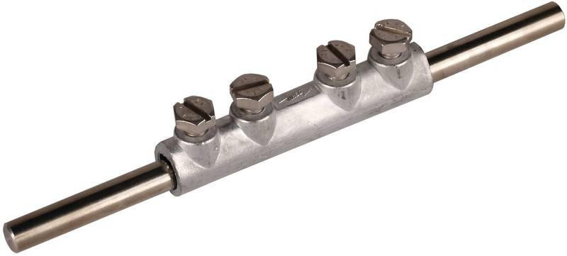 Verbindungsmuffen nach DIN EN 62561-1, für den Zusammenschluss von zwei Rundleitern in Längsanordnung mit vier Schrauben M6. Ausführung ZG 8.