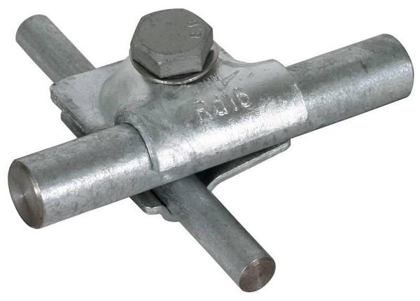 MehrzweckVerbindungs-Klemme nach DIN EN 62561-1, zur universellen Verwendung als Kreuz-, T- und Parallelklemme von Rundleitern an Fangstangen. Ausführung zweiteilig mit Sechskantschraube, Federscheibe und Gewinde im Unterteil.