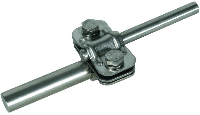 UNI-Trennklemme zum Verbinden einer Fangstange oder einer Erdeinführung mit einem Rundleiter. Blitzstromtragfähigkeit geprüft bis 200 kA (10/350 µs) in Anlehnung an DIN EN 62561-1. Ausführung mit Federring sowie Zwischenplatte für Rund- und Flachleiter.