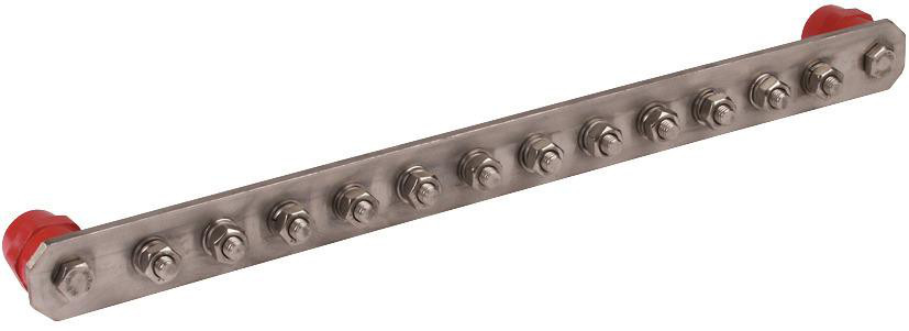Potentialausgleichsschiene Industrie nach DIN EN 62561-1, für den Schutz und Funktionspotentialausgleich nach DIN VDE 0100 Teil 410/540 und den Blitzschutz-Potentialausgleich nach DIN EN 62305-3 (VDE 0185-305-3). Mit Isolator UP (duroplastisch, rot) mit Gewinde M10, UV-stabilisiert und halogenfrei. Auch für den Einsatz in Ex-Bereichen geeignet (Selbstlockern der Schrauben gesichert). Ausführung mit 12 Anschlüssen - Schraube M10, Federring und Mutter.