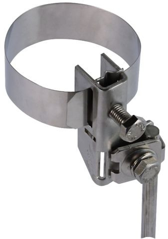 Antennen-Bandrohrschelle nach DIN EN 62561-1, zum Einbinden von Rohren in den Schutz und Funktionspotentialausgleich nach DIN VDE 0100-410/540 und den Blitzschutz-Potentialausgleich nach DIN EN 62305-3 (VDE 0185-305-3). Ausführung komplett mit stetig verstellbarem Spannband aus NIRO, zum Anschluss von 1 Leiter Rd D10 mm oder 1-2 Leiter Rd D6-8 mm oder 4-50 mm² (ein- / mehrdrähtig).