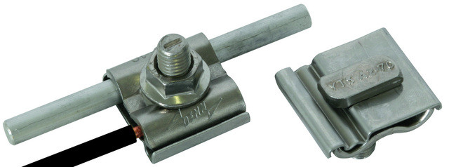 UNI-Erdungsklemme zum Einbinden von Anlagenteilen in den Funktionspotentialausgleich, Blitzschutz-Potentialausgleich oder in die Funktionserdung. Ausführung NIRO, mit Hammerkopfschraube M10 (38/17) und Sperrzahnmutter. Durch die Kontaktplatte (Zwischenelement) aus NIRO können unterschiedliche Werkstoffe des Leiters (Cu, Al, St/tZn und NIRO) mit den üblichen Montagesystemen z. B. aus Aluminium verbunden werden, ohne dass Kontaktkorrosion entsteht. Durch die Ausführung mit Doppelüberleger können einfach und schnell die Profile untereinander z. B. mit Durchgangsverdrahtung angeschlossen werden.