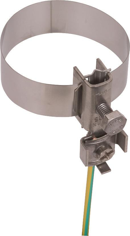 Erdungsbandrohrschelle zum Einbinden von Rohren in den Schutz und Funktionspotentialausgleich nach DIN VDE 0100-410/540. Ausführung Standard, mit stetig verstellbarem Spannband aus NIRO, zum Anschluss von 1 oder 2 Leitern oder Durchgangsverdrahtung, Anschlussquerschnitt 4–25 mm².