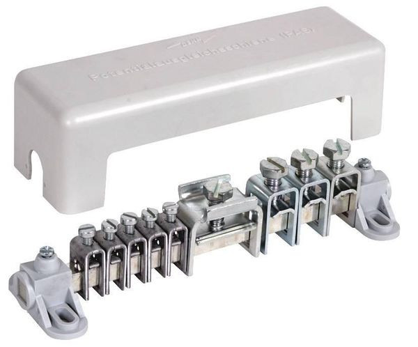Potentialausgleichsschiene nach DIN EN 62561-1, für den Schutz- und Funktionspotentialausgleich nach DIN VDE 0100-410/540 (Haupterdungsschiene) und den Blitzschutz-Potentialausgleich nach DIN EN 62305-3 (VDE 0185-305-3). Ausführung B, geprüft nach DIN VDE 0609, Reihenklemmen aus St/gal Zn, Schienenböcke und Abdeckhaube aus Kunststoff, grau (halogenfrei), Abdeckung plombierbar und beschriftbar.