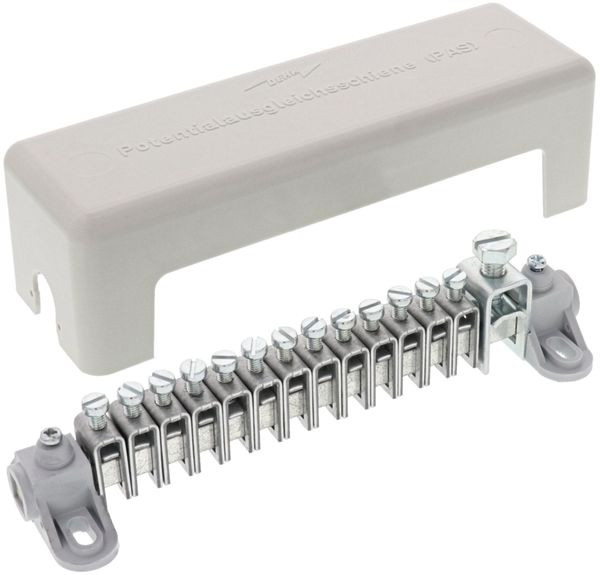 Potentialausgleichsschiene nach DIN EN 62561-1, für den Schutz- und Funktionspotentialausgleich nach DIN VDE 0100-410/540 (Haupterdungsschiene) und den Blitzschutz-Potentialausgleich nach DIN EN 62305-3 (VDE 0185-305-3). Ausführung C, geprüft nach DIN VDE 0609, Reihenklemmen aus St/gal Zn, Schienenböcke und Abdeckhaube aus Kunststoff, grau (halogenfrei), Abdeckung plombierbar und beschriftbar.