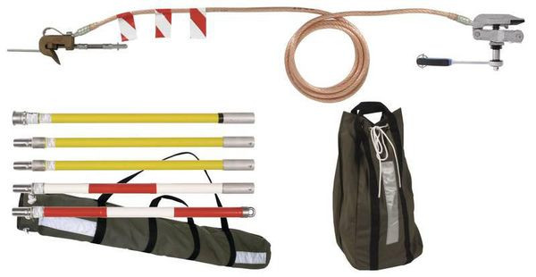 Erdungs- und Kurzschließvorrichtungsset in PKW-Ausführung (nicht profilfrei) nach DIN VDE 0683-100 (EN/IEC 61230) zum Erden und Kurzschließen elektrischer Oberleitungen an der Arbeitsstelle nach DIN VDE 0105-100 (EN 50110). Inklusive Erdungsstangenset (6-teilig), zwei einpoligen Erdungs- und Kurzschließvorrichtungen, 8,5 m lang, Ausführung Ratsche und Segeltuchtasche.