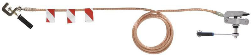 Einpolige Erdungs- und Kurzschließvorrichtung nach DIN VDE 0683-100 (EN/IEC 61230) für Masten oder Baumaschinen, Hebezeuge und Bahndienstwagen zum Erden an der Schiene; 8,5 m lang, mit Universalklemme, Handgriff aus Kunststoff und Schienenanschlussklemme (Ratsche) bestückt.